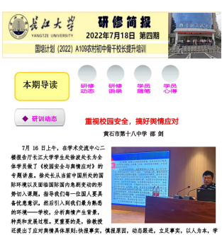 按照湖北省教育厅的统一部署,由我院承办的2022年湖北省国培计划“农村初中骨干校长提升”培训经过前期周密的准备与安排,于2022年7月12日正式开班,本期培训班迎来了湖北省黄石、天门、仙桃、宜昌、荆州、孝感6个地市的100名农村初中骨干校长,培训分集中研修、岗培训、返岗实践三阶段进行。