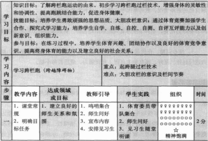 (4)检验学习成果,各组之间进行看谁的动作优美、技术动作合理、栏间节奏好的比赛,培养学生体育兴趣和团结协作、勇敢顽强的思想品质以及良好的体育竞争意识,提高终身体育的能力。